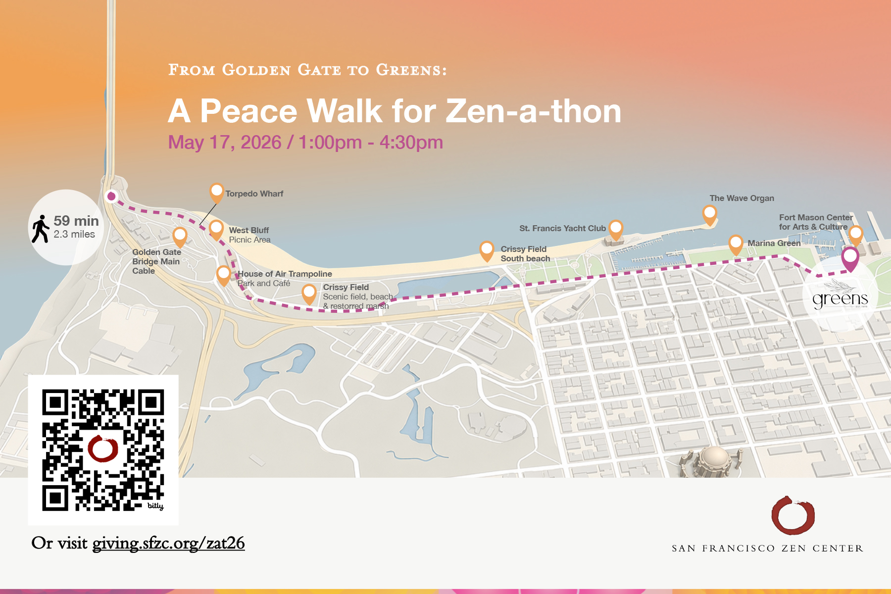 Beginning at the Golden Gate Bridge, SFZC priest Anshi Zachary Smith will lead this 3 mile walk through the Presidio, Crissy Field, and the Marina Green to Fort Mason. There we will have a closing ceremony and dedicate the merit of our effort to the awakening of all beings. An optional ticketed reception follows at Greens Restaurant, with food and beverages.